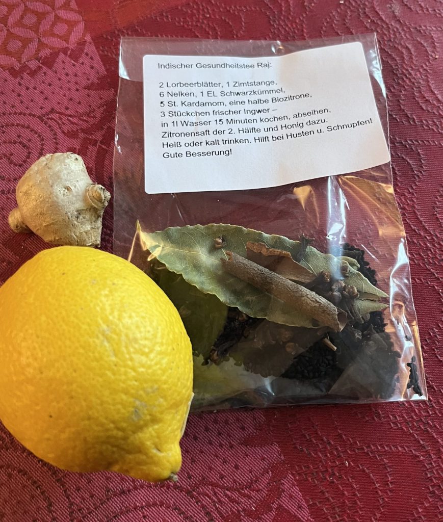 Wir sind mitten in der Erkältungszeit und weil der Herr Paul in seinem Wein- und Schokoladengeschäft in Hermsdorf in der Heinsestraße den Gesundheitstee „Raj“ so lobte und eine Kundin interessiert zuhörte, habe ich versprochen das Rezept auf meine Website zu setzen. Hier ist es! Wir wünschen gute Besserung!
